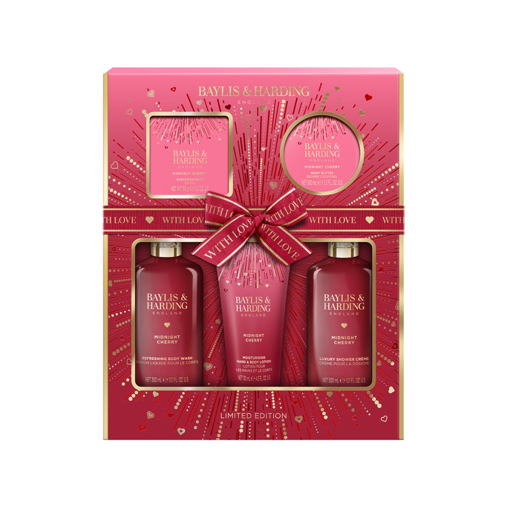 Midnight Cherry - sada s péčí o tělo, 5 ks sada tělových produktů se šťavnatou, třešňovou vůní v dárkovém balení s mašlí