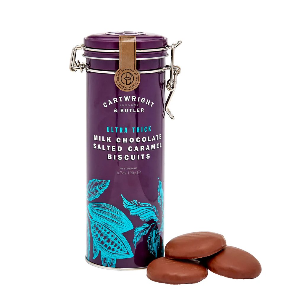 Sušenky se slaným karamelem máčené v mléčné čokoládě jsou zážitkem pro všechny, kteří milují spojení křupavého pečiva a jemné čokolády. V Cartwright & Butler obalili ikonickou sušenku se slaným karamelem v té nejjemnější mléčné čokoládě. Přidali další vrstvu čokolády, a nakonec ještě jednu pro dokonalý požitek! Výsledkem je sušenka, která je z jedné třetiny křupavá a ze dvou třetin bohatě čokoládová. Tento sladký poklad je zabalen v typické plechovce s klipsem.