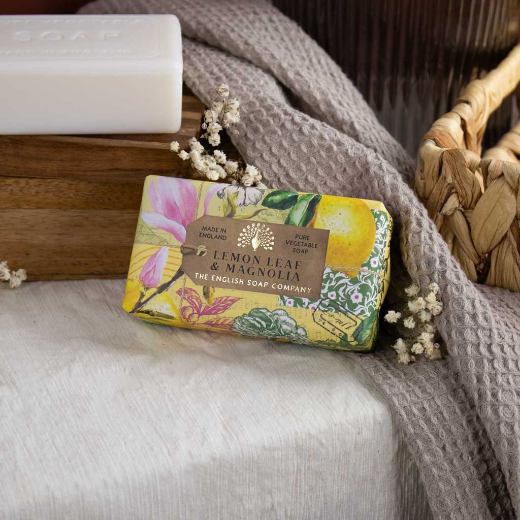 Dopřejte si jedinečný zážitek z luxusní péče o pokožku s tuhým mýdlem Lemon Leaf & Magnolia od English Soap Company.