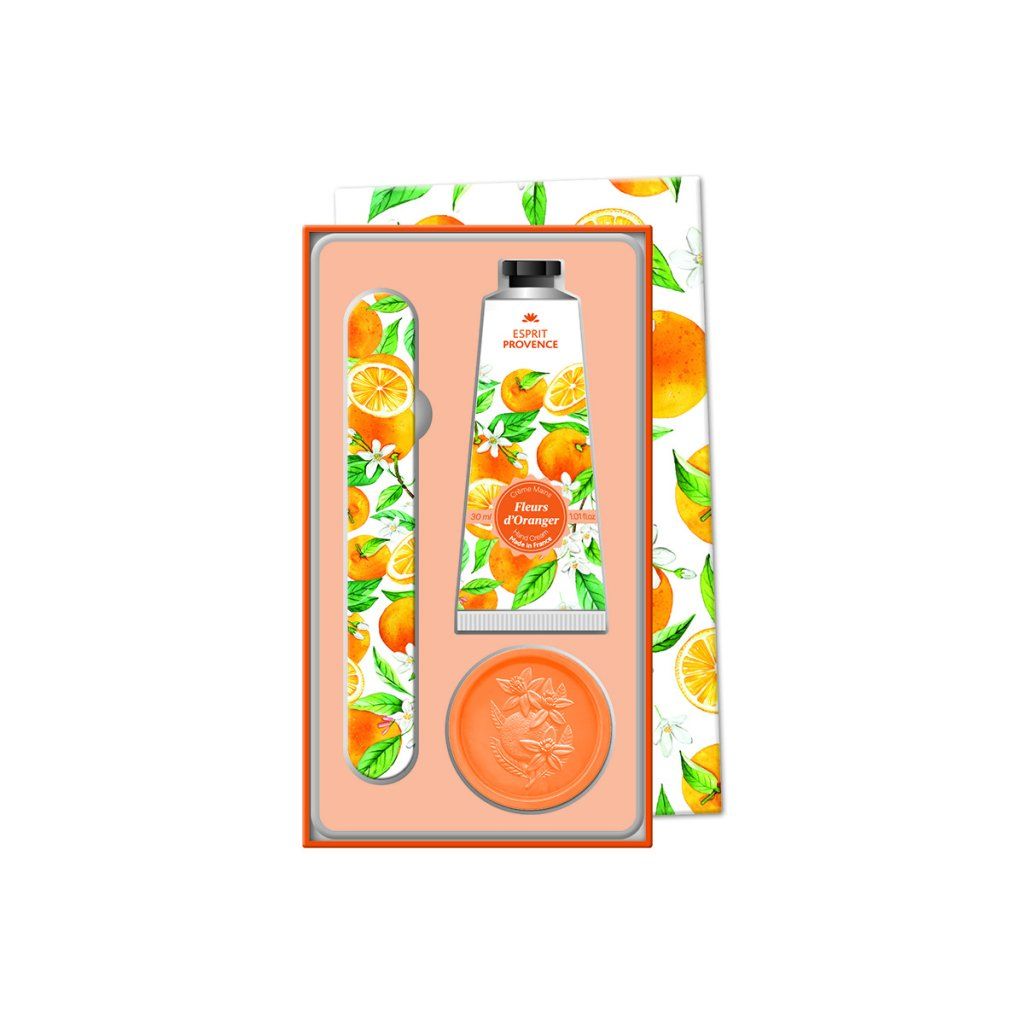 Elegantní dárková sada péče o ruce od značky Esprit Provence s jemnou vůní pomerančového květu představuje ideální tip na dárek i praktického společníka pro každodenní péči o ruce. Sada obsahuje vše potřebné pro čisté, hydratované a upravené ruce – krém na ruce, tuhé mýdlo a pilník na nehty v kompaktním provedení vhodném i na cesty.