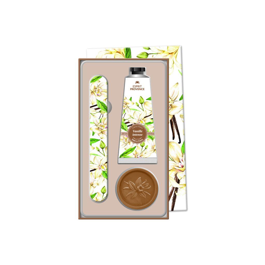 Elegantní dárková sada péče o ruce od značky Esprit Provence s hřejivou vůní vanilky představuje ideální tip na dárek i praktického společníka pro každodenní péči o ruce. Sada obsahuje vše potřebné pro čisté, hydratované a upravené ruce – krém na ruce, tuhé mýdlo a pilník na nehty v kompaktním provedení vhodném i na cesty.
