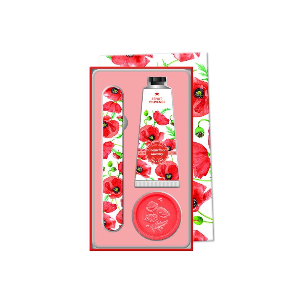 Elegantní dárková sada péče o ruce od značky Esprit Provence s jemnou vůní vlčího máku představuje ideální tip na dárek i praktického společníka pro každodenní péči o ruce. Sada obsahuje vše potřebné pro čisté, hydratované a upravené ruce – krém na ruce, tuhé mýdlo a pilník na nehty v kompaktním provedení vhodném i na cesty.