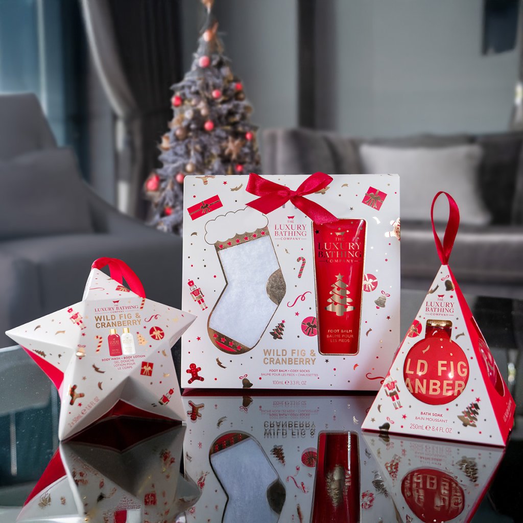 Wild Fig & Cranberry - sada s péčí o nohy, 2 ks vánoční dárková sada ponožek a vyživujícího balzámu na chodidla s vůní brusinek a fíků
