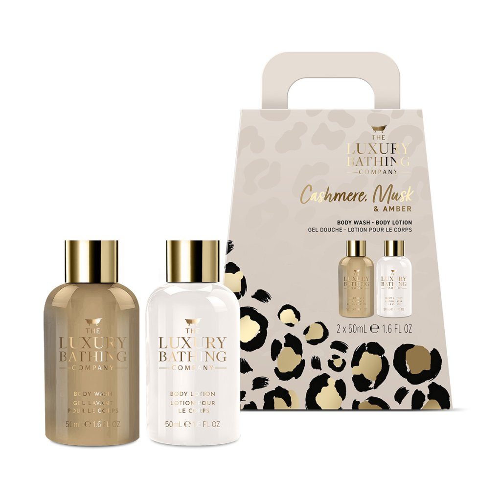 Cashmere, Musk & Amber - mini sada péče o tělo, 2 ks mini sada tělového mýdla a mléka v dárkové krabičce na zavěšení