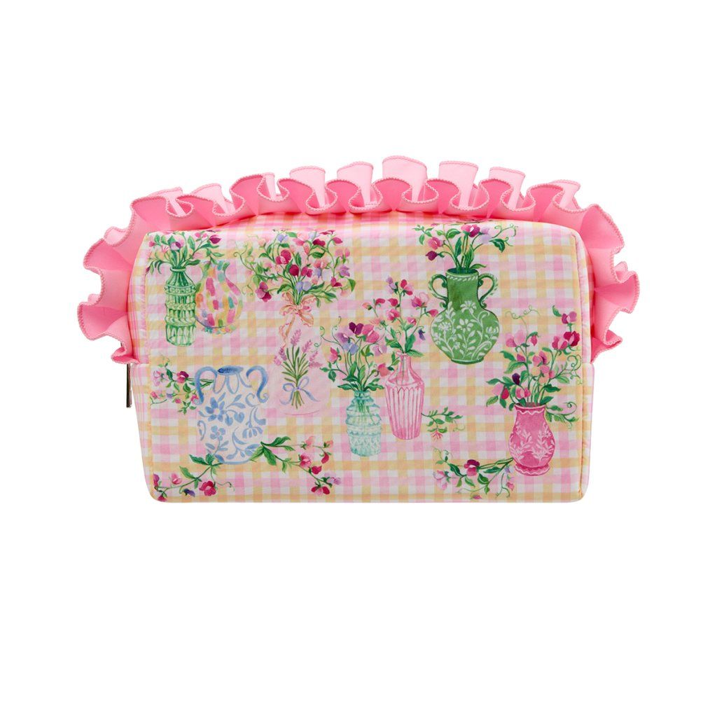 Stylová kosmetická taštička Sweet Pea spojuje praktičnost s něžným, typicky britským designem. Růžovo-žlutý kostkovaný podklad zdobí ručně malované motivy hrachoru v romantických vázách a květináčích, zatímco výrazný růžový volán po obvodu dodává taštičce hravý a ženský charakter. Prostorný, pevný tvar udrží všechny vaše kosmetické nezbytnosti přehledně uspořádané – ať už doma na toaletním stolku, nebo na cestách.