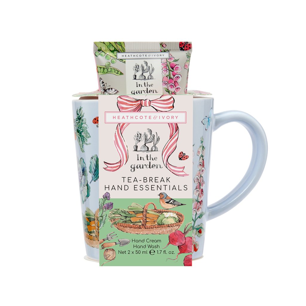 Dopřejte si příjemnou pauzu během zahradničení s dárkovou sadou In The Garden, která spojuje hřejivou chvilku s čajem nebo kávou a pečující rituál pro unavené ruce. V krásném tyrkysovém hrnku s motivy zahrady se ukrývá jemné tekuté mýdlo s vůní růže a vyživující krém na ruce provoněný svěžími tóny rebarbory a máty.