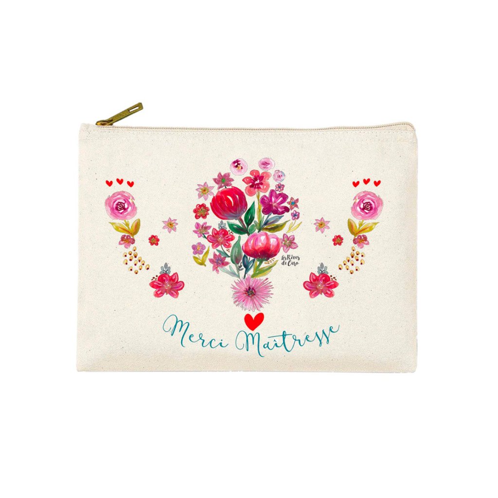 Malá kosmetická taštička s nápisem Merci maîtresse "Děkuji, paní učitelko" od francouzské značky Hirondelles & Cie zdobí krásný květinový motiv malovaný akvarelem.