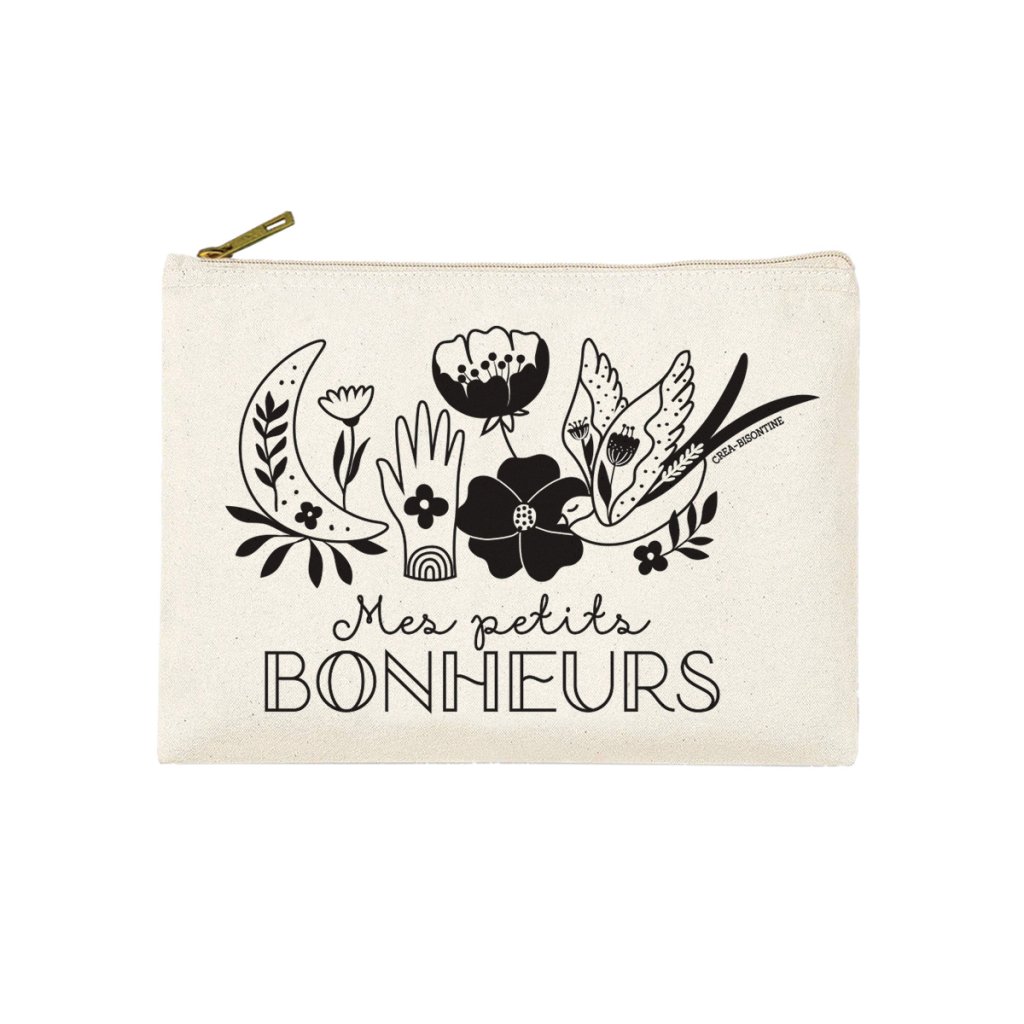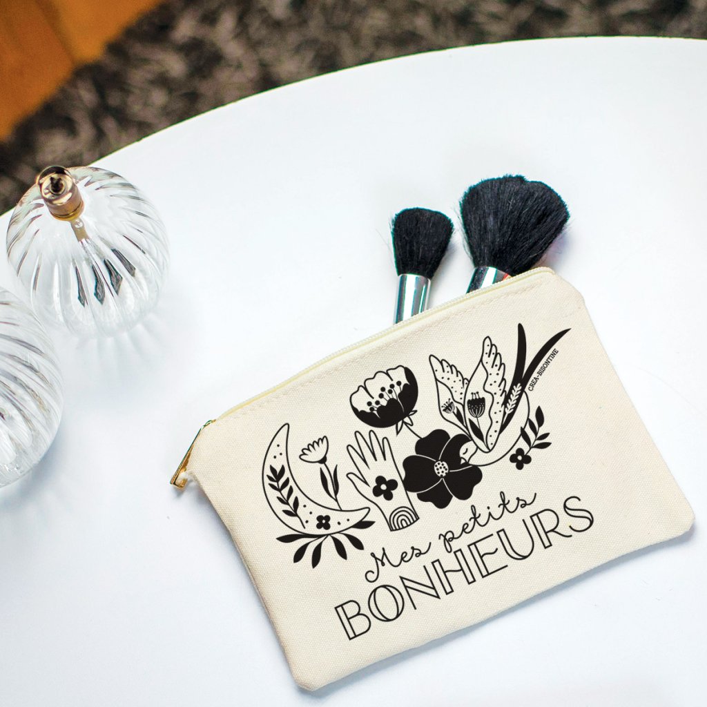 Malá kosmetická taštička s nápisem Mes petits bonheurs "Moje malé radosti" od francouzské značky Hirondelles & Cie zdobí originální motiv ilustrátorky Créy Bisontine. Černobílá ilustrace s květinovými a symbolickými prvky doplňuje jemný nápis a vytváří výrazný grafický motiv.