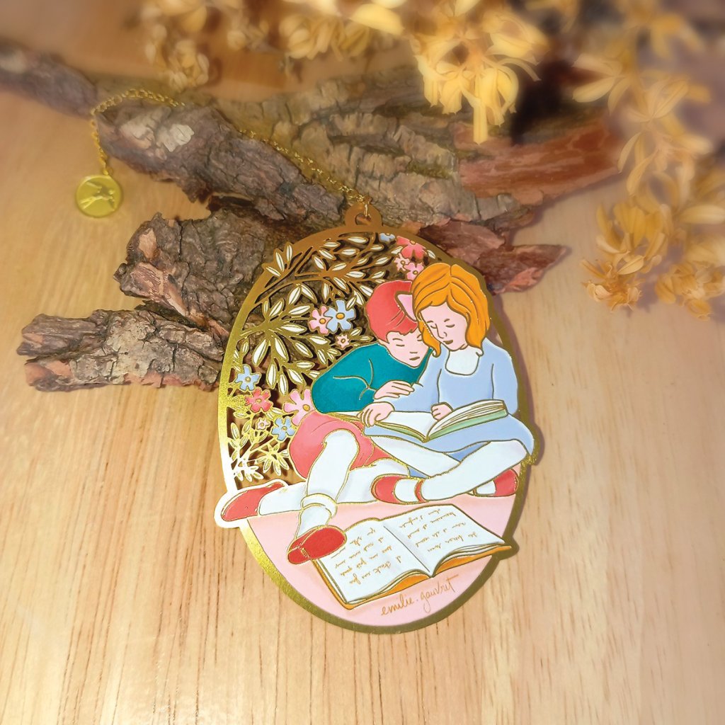 Autorská ilustrace Emilie Gauvrit zachycuje něžný moment sdíleného čtení a přináší do každé knihy kapku nostalgie. Díky zlatému řetízku s ozdobným přívěskem záložka elegantně vyčnívá z knihy a působí jako malý šperk mezi stránkami.