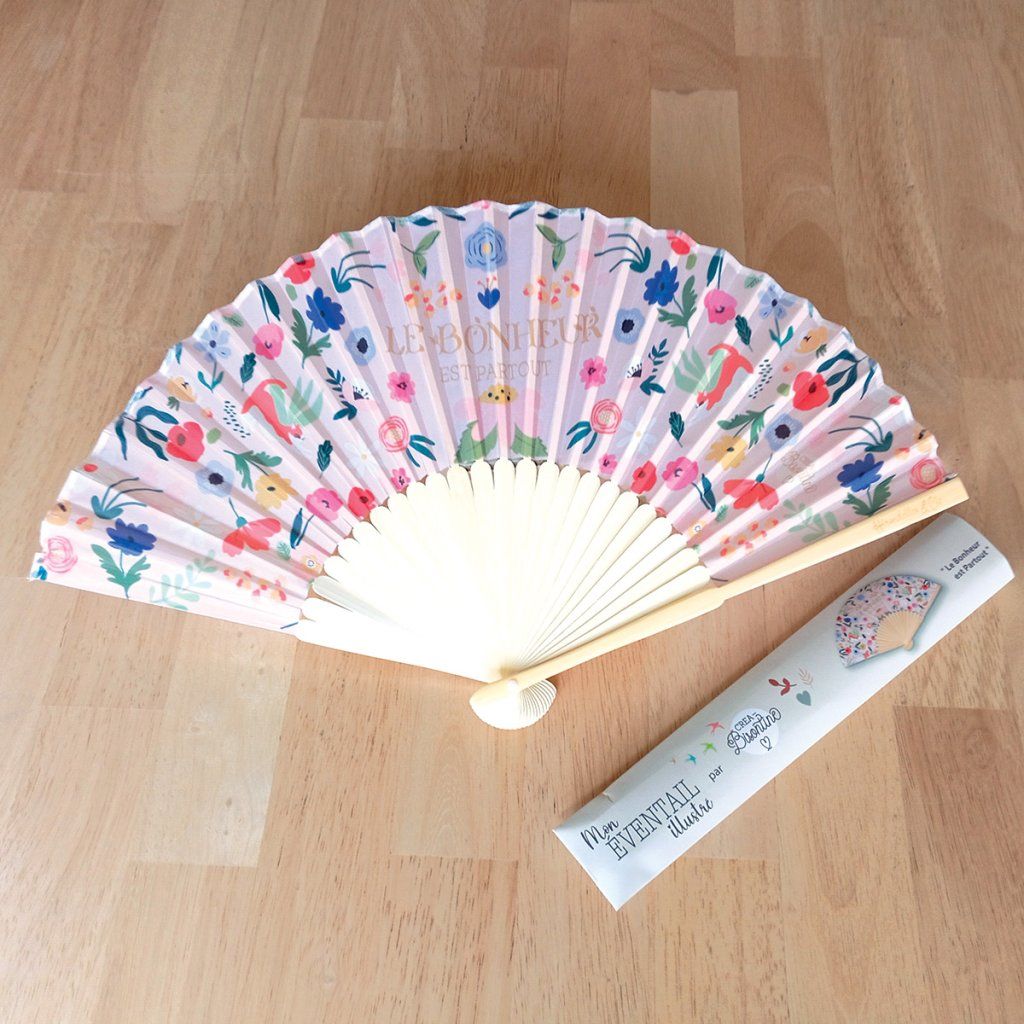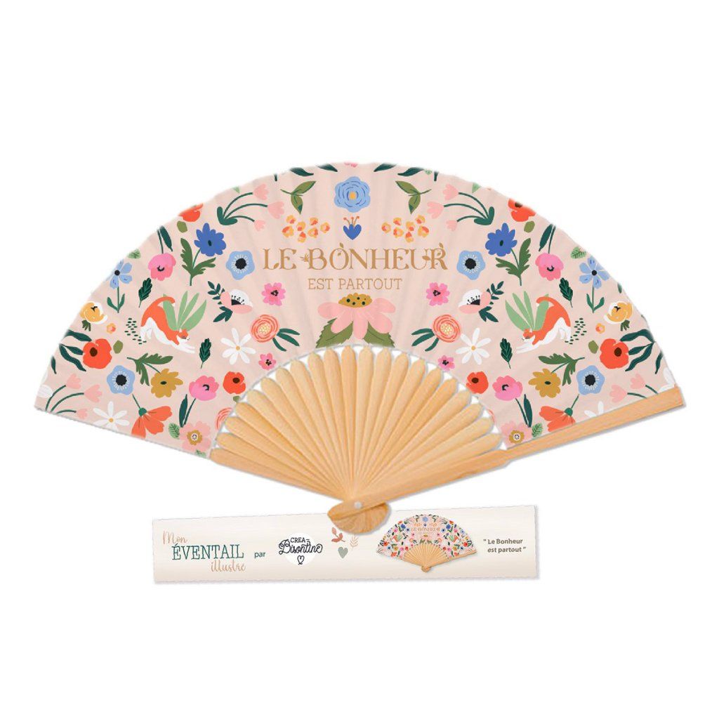 Nádherný vějíř od francouzské značky Hirondelles & Cie zdobí autorská ilustrace Créy Bisontine plná květin, jemných přírodních motivů a zlatého nápisu „Štěstí je všude“.