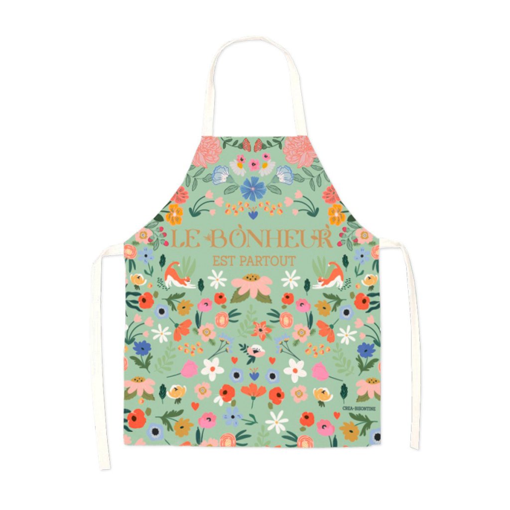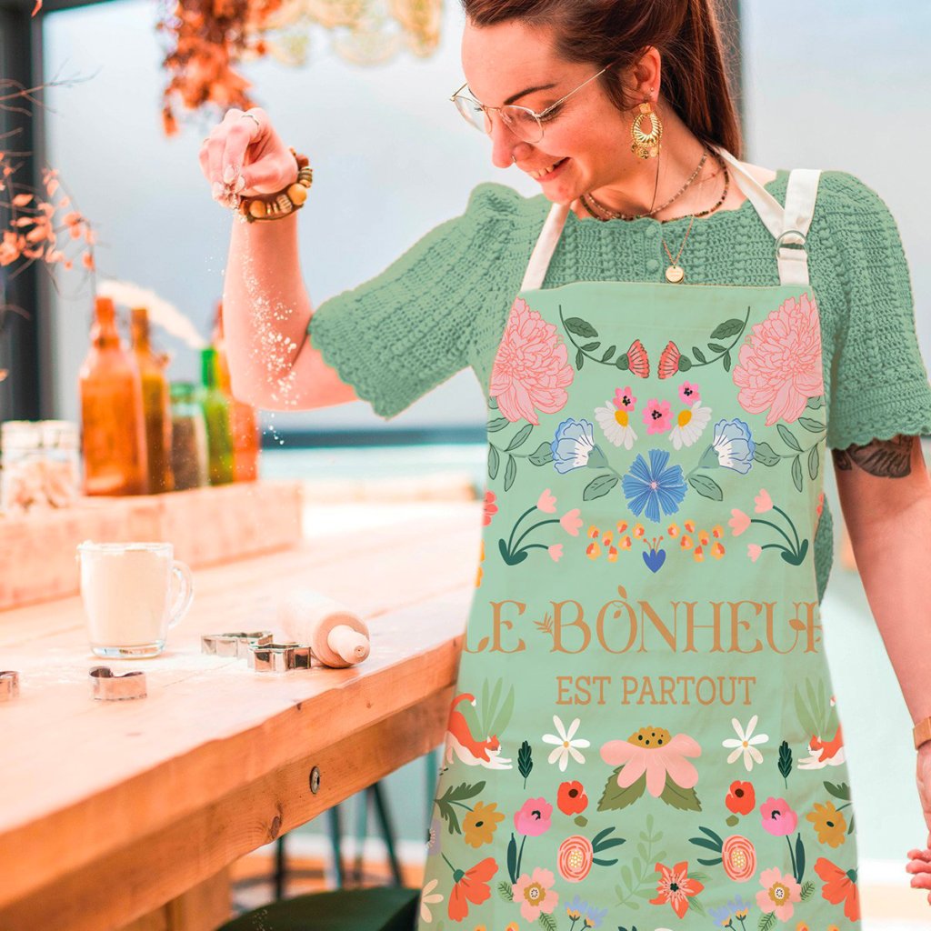 Kuchyňská zástěra z oblíbené kolekce "Štěstí je všude" přichází v nové zelené variantě s jemnými květinovými motivy a hravými detaily.