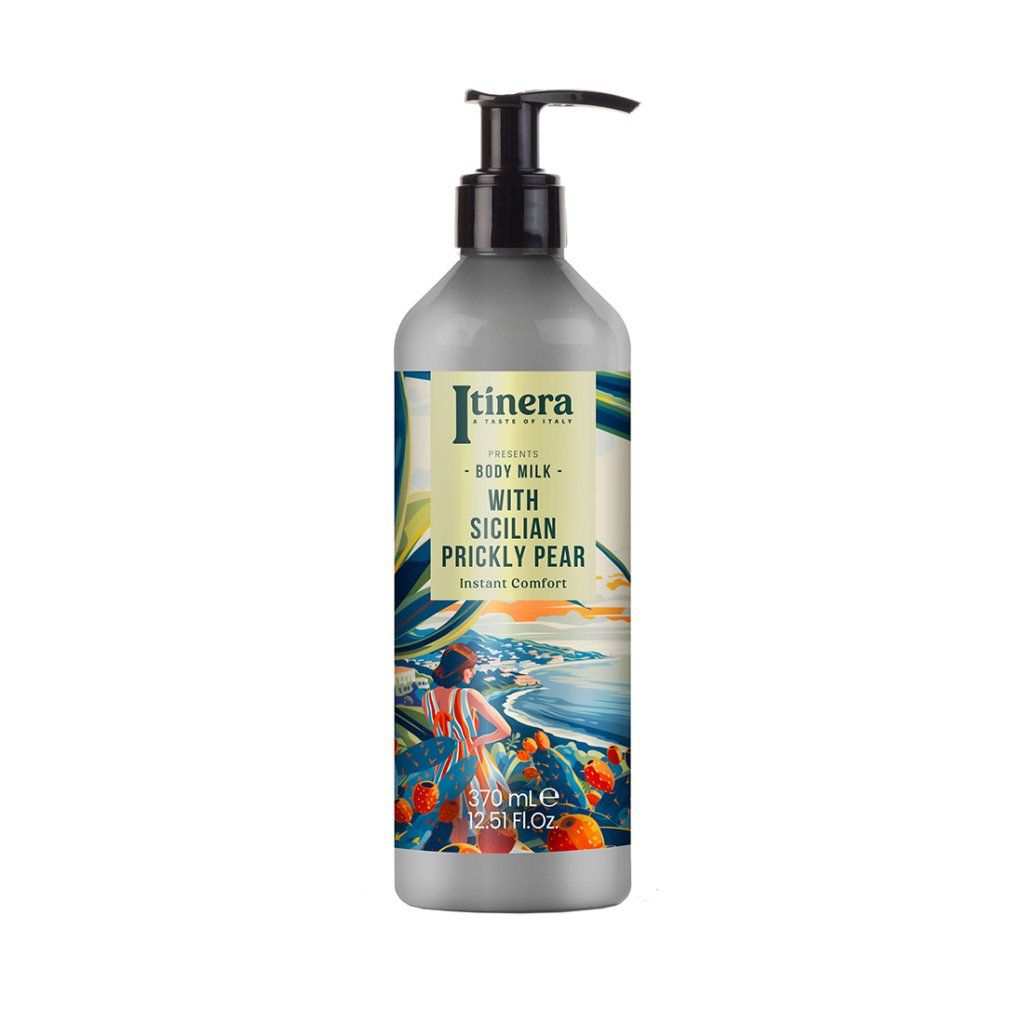 Tělové mléko italské značky Itinera přináší okamžitou hydrataci a komfort pro pokožku díky lehké, rychle se vstřebávající textuře. Složení s 97 % přírodních složek kombinuje olej ze sladkých mandlí, glycerin, extrakt z aloe vera a vitamín E, které společně zajišťují intenzivní hydrataci, zklidnění a ochranu pokožky po celý den. Extrakt z opuncie ze slunné Sicílie dodává pokožce antioxidační účinky a pomáhá udržet její pružnost a zdravý vzhled. Přírodní výtažek z lístků rukoly se postará o zklidnění a jemnou regeneraci. Tělové mléko zanechává pokožku zářivou, hebkou a provoněnou osvěžujícími tóny opuncie, zelených lístků a dřeva.