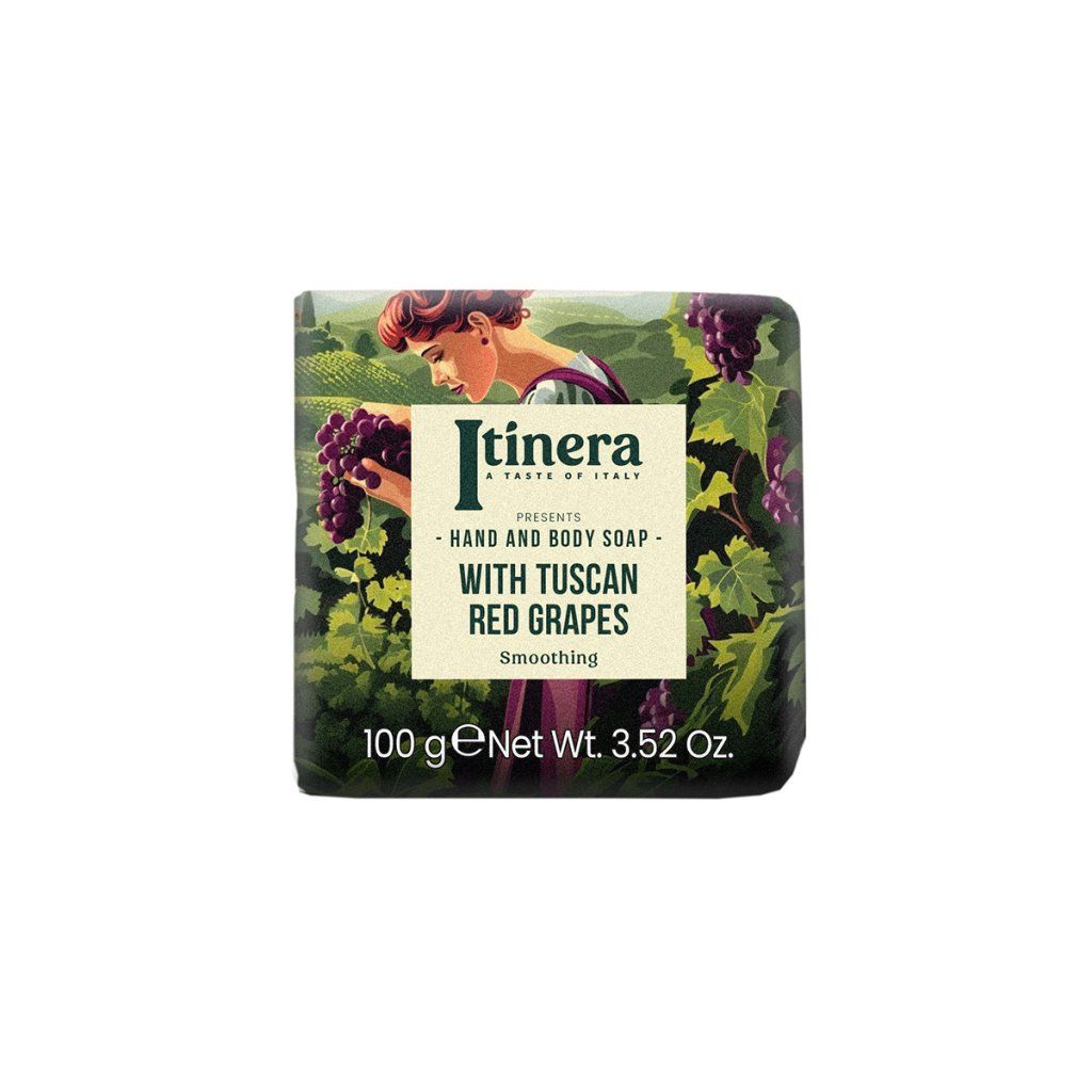 Dopřejte své pokožce jedinečnou péči s Itinera tuhým mýdlem na ruce i tělo, obohaceným o extrakt z toskánských červených hroznů s obsahem AHA kyselin, které přirozeně podporují jemnou exfoliaci a zanechávají pokožku hladkou, svěží a zdravou. Toto rostlinné mýdlo obsahuje 97 % přírodních složek a je obohaceno o glycerin, který zajišťuje hydrataci a zabraňuje vysoušení. Výtažky z jablek z Trentina, citronů z pobřeží Amalfi a pšeničných otrub z Pádské nížiny poskytují pokožce výživu, tonizaci a podporují její přirozenou regeneraci. Smyslná vůně koření, mošusu, ovoce a vanilky navozuje atmosféru procházky po slunných toskánských vinicích při západu slunce. Ekologické balení podtrhuje závazek značky k udržitelnosti.