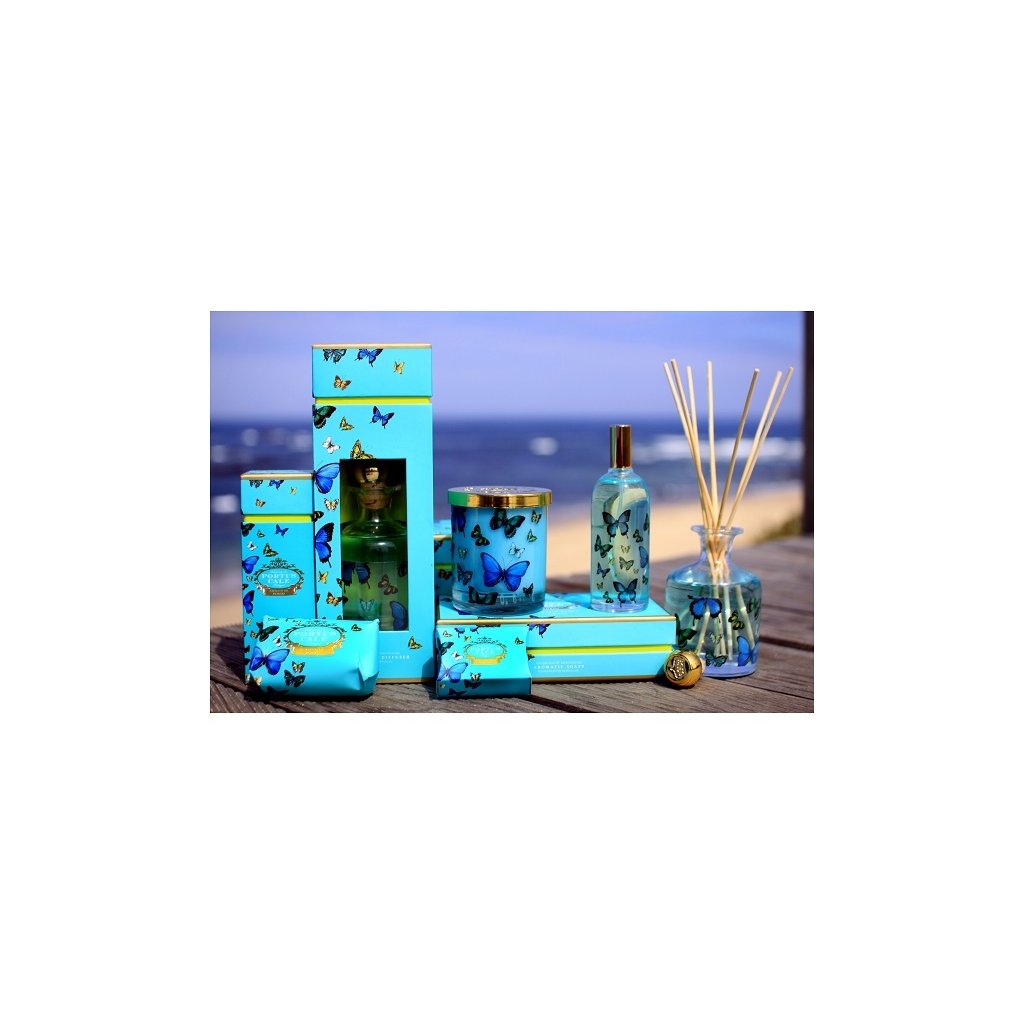 Vůně "Butterfly" je svěží citrusová vůně grepů, mandarinek, citrónů, pomerančů, zimolezu, magnólie a koriandru. Barevné tyrkysové balení s motivem motýlků připomíná letní mořský vánek.