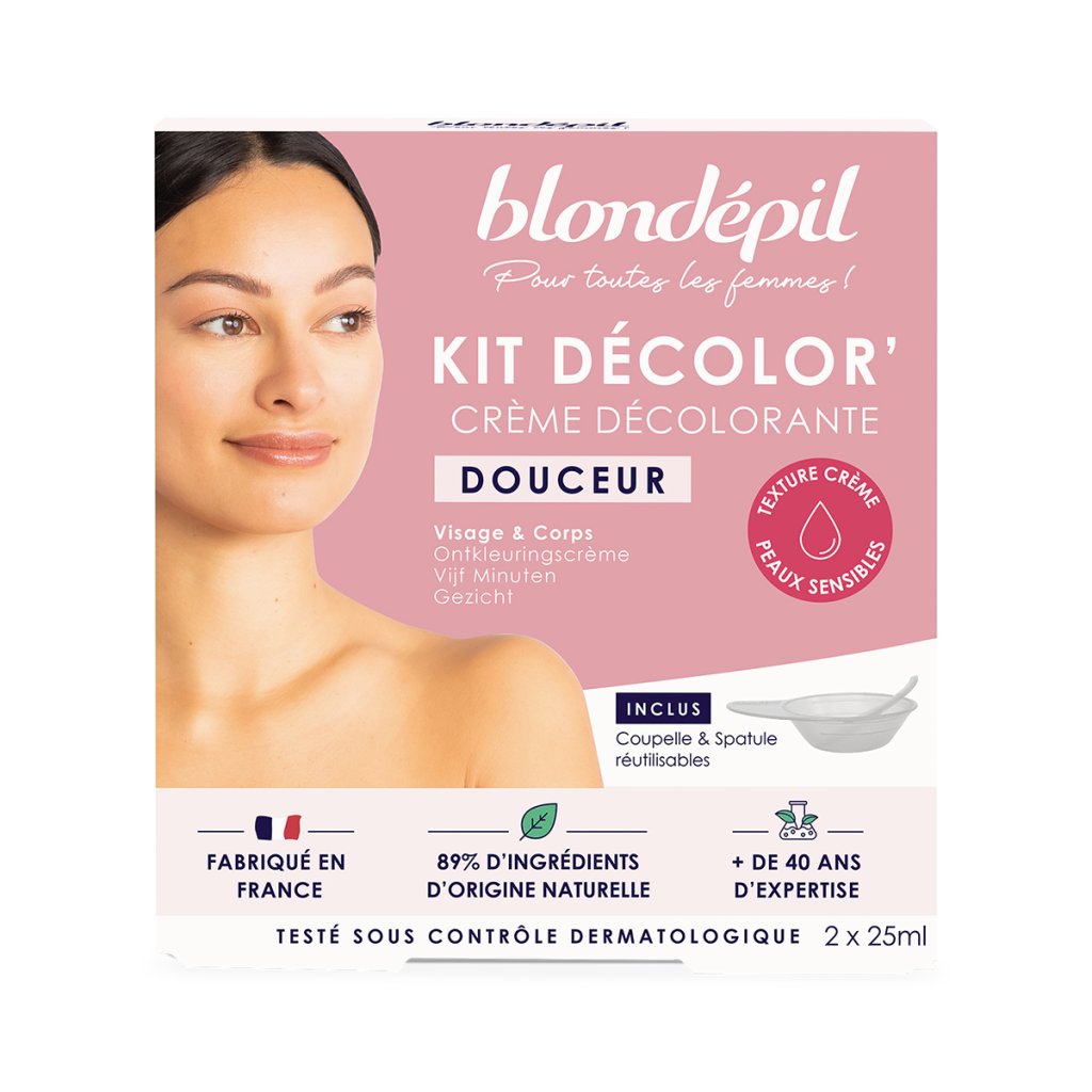 Rozlučte se s tmavými chloupky na obličeji! Blondépil Kit Décolor’ byl speciálně vyvinut pro citlivou pokožku a jemně zesvětluje chloupky na obličeji tak, aby dokonale splynuly s tónem pleti. Krémová textura je šetrná k pokožce a přináší přirozený světlý efekt až na 4 týdny.
