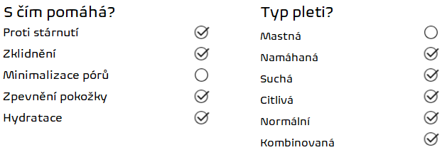 | Typ pleti: | vrásky a zralá pleť, suchá, citlivá |